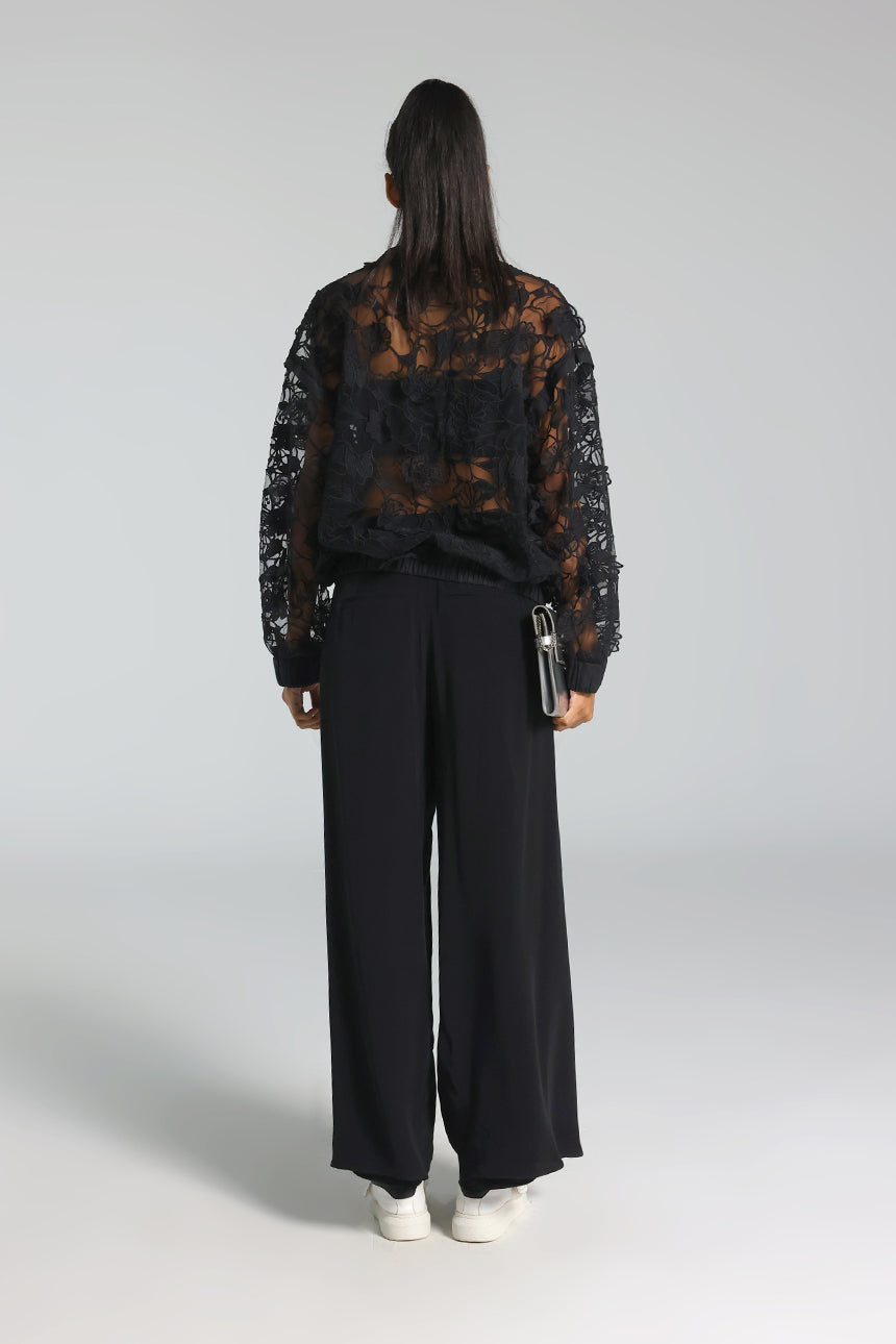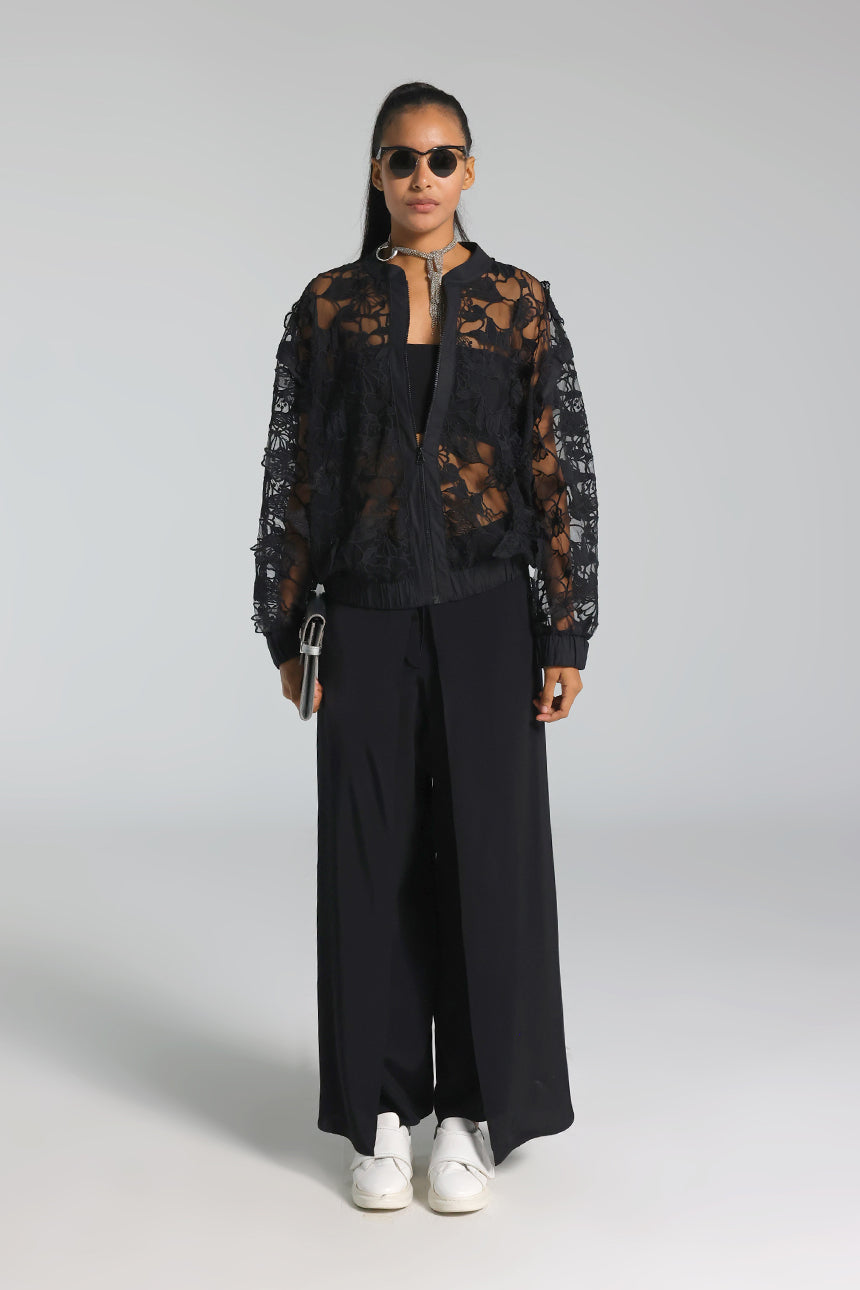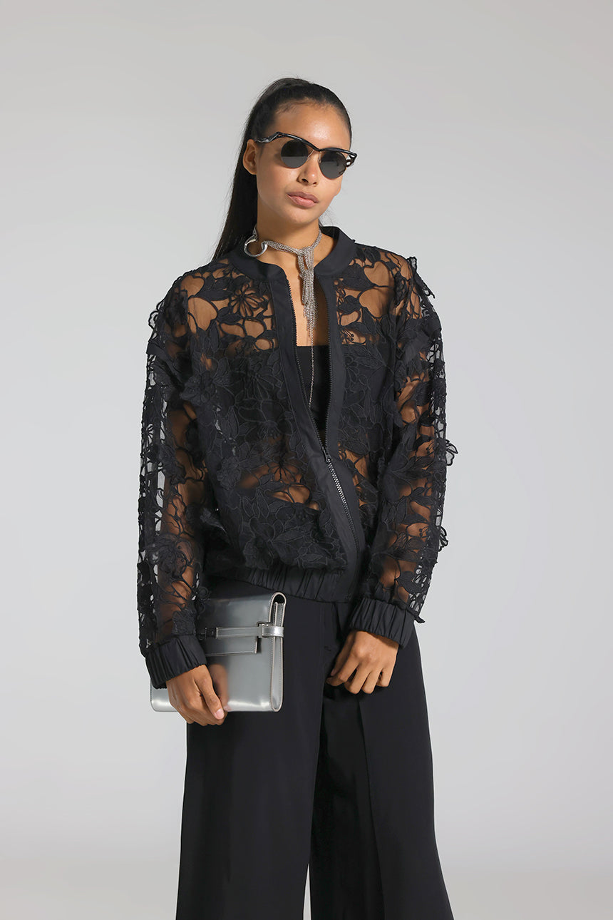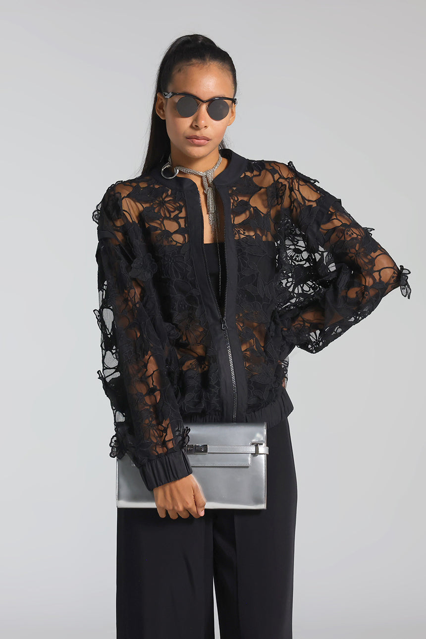 Etek ve kol uçlarındaki elastik yapı ile spor şıklığı destekleyen bu dantel ceket; ön fermuarı ve zarif dokusuyla hem gece hem gündüz kullanılabilecek modern bir dış giyim parçasıdır.