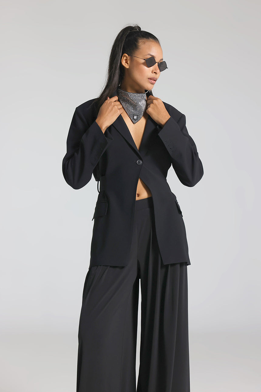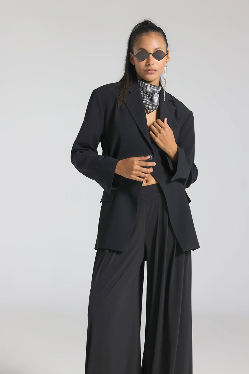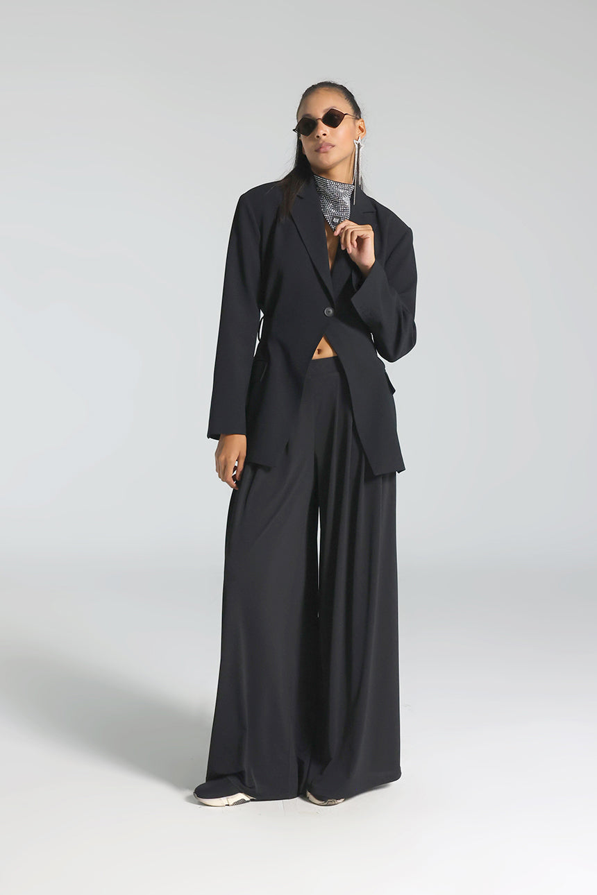 Yatık pile detayı ve rahat kesimiyle öne çıkan bu pantolon, hem şık hem konforlu bir stil sunar.