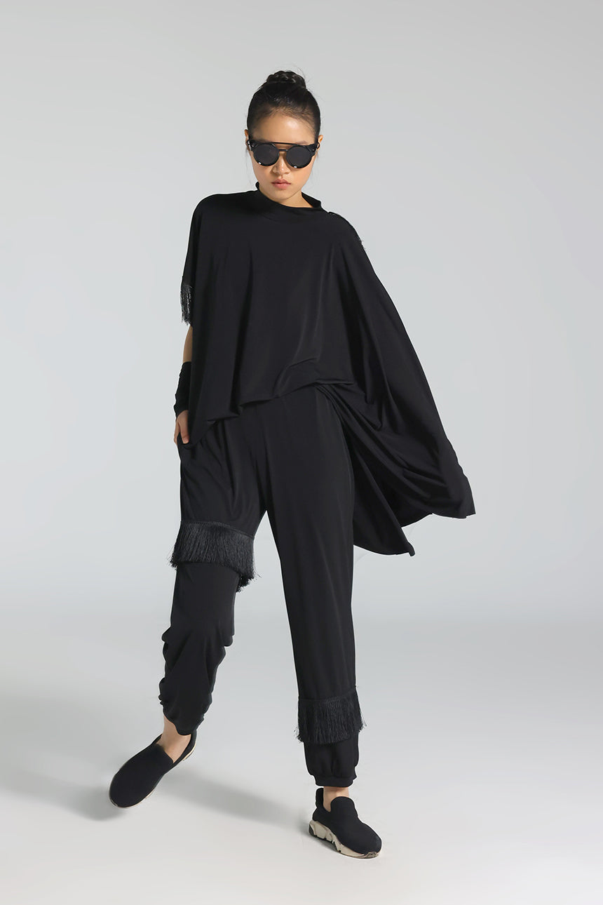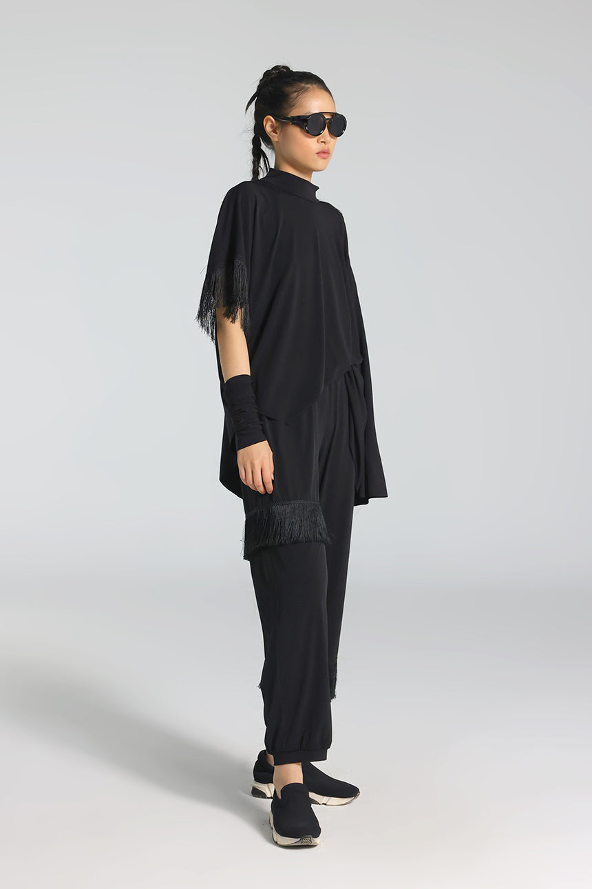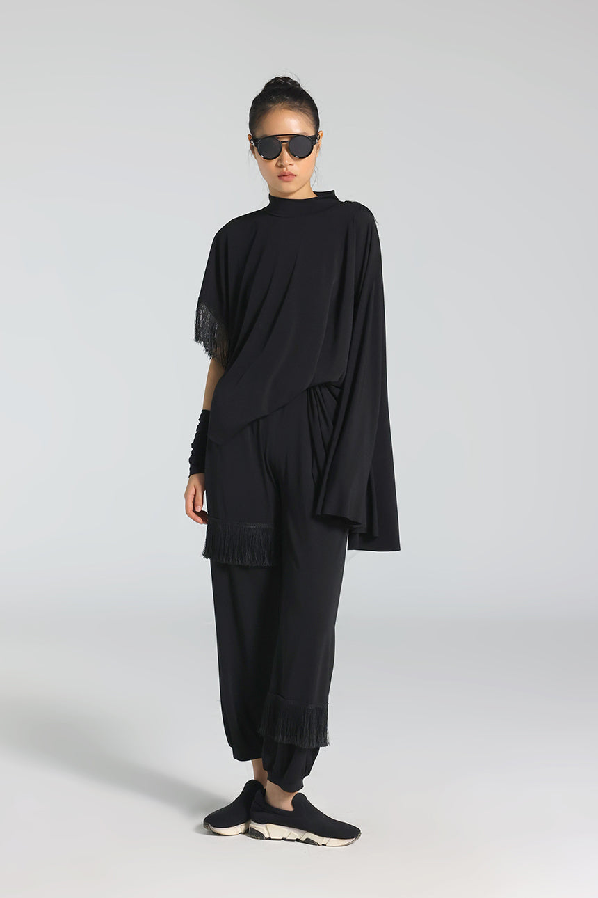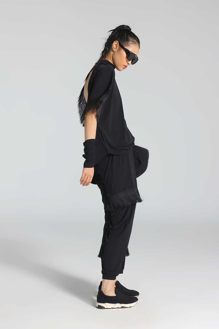 Balıkçı yakası, sırt dekoltesi ve ince püskül detaylarıyla feminen ve iddialı bir görünüm sunan bu bluz; asimetrik kesimiyle modern bir siluet oluşturur. Akşam ve özel davet stillerinin güçlü parçasıdır.