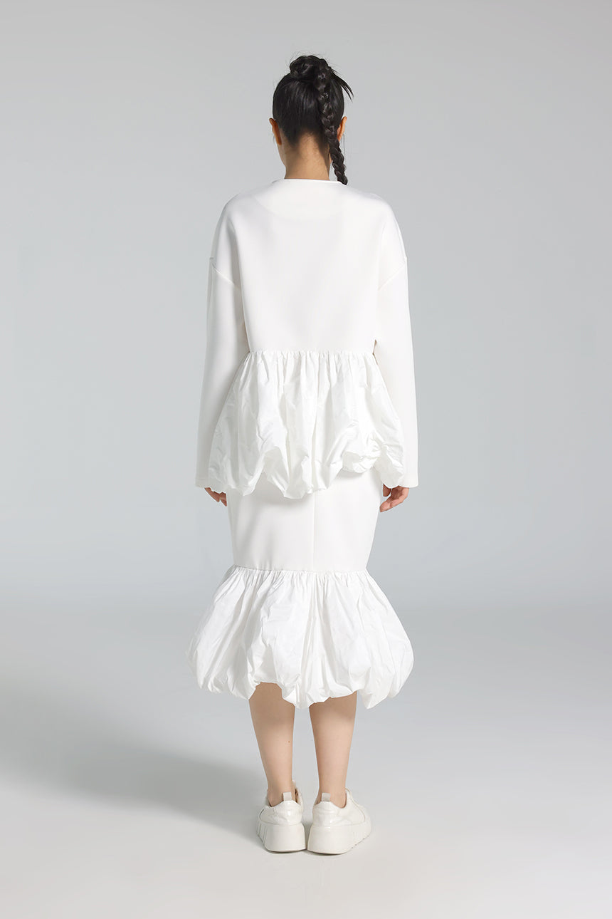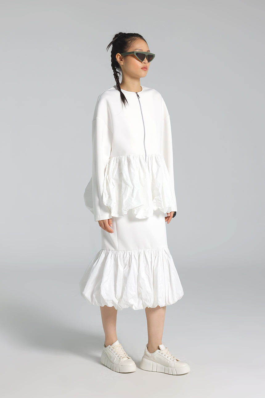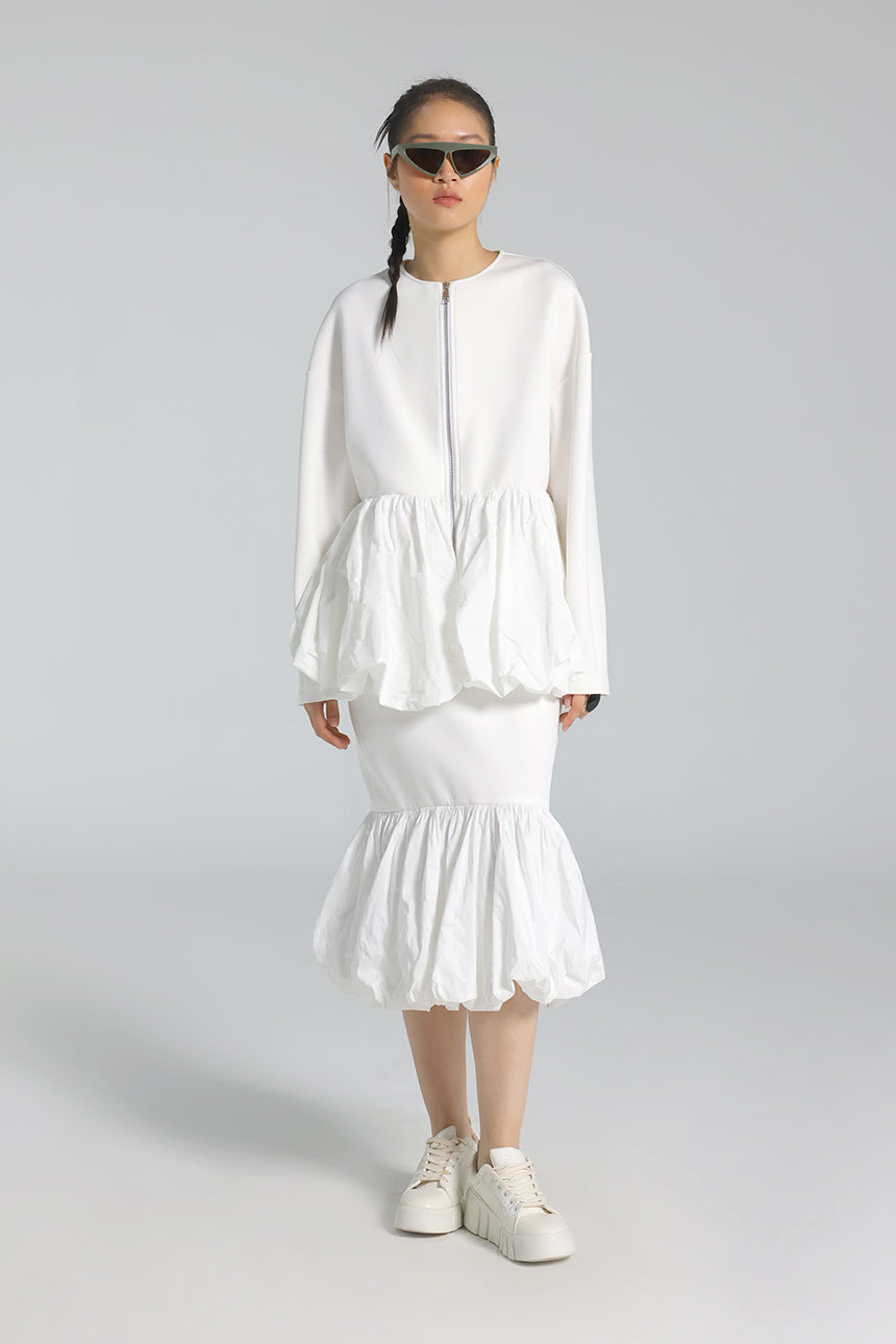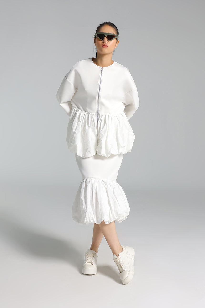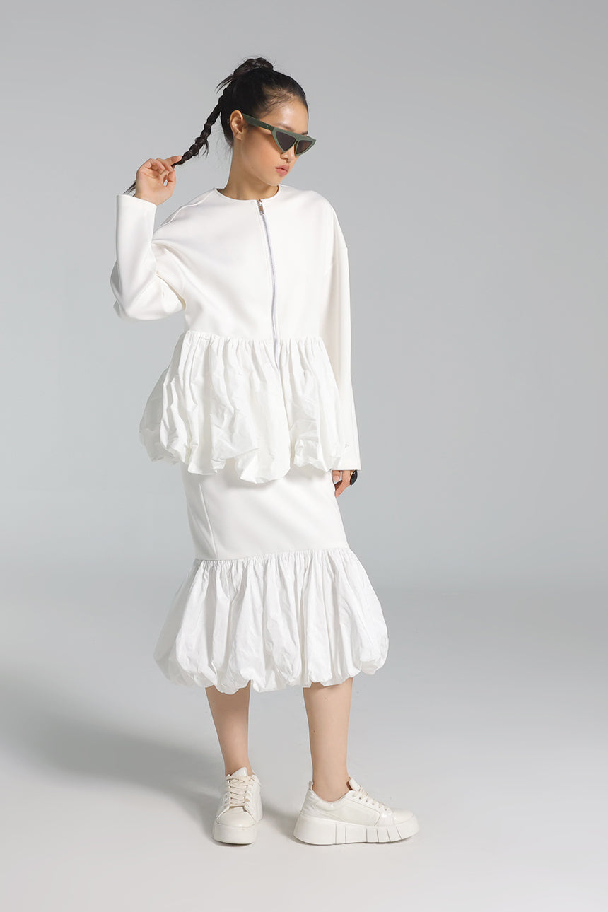 Dar kesimiyle vücuda oturan siluet sunan bu modern etek, etek ucundaki balon formuyla hacim ve dinamizm katar. Yandan fermuarlı yapısı sayesinde hem kolay giyilir hem temiz bir görünüm oluşturur. Gündüzden geceye farklı kombinlerle uyum sağlayabilen bu parça, modern ve sofistike bir stil arayanlar için ideal bir seçimdir.
