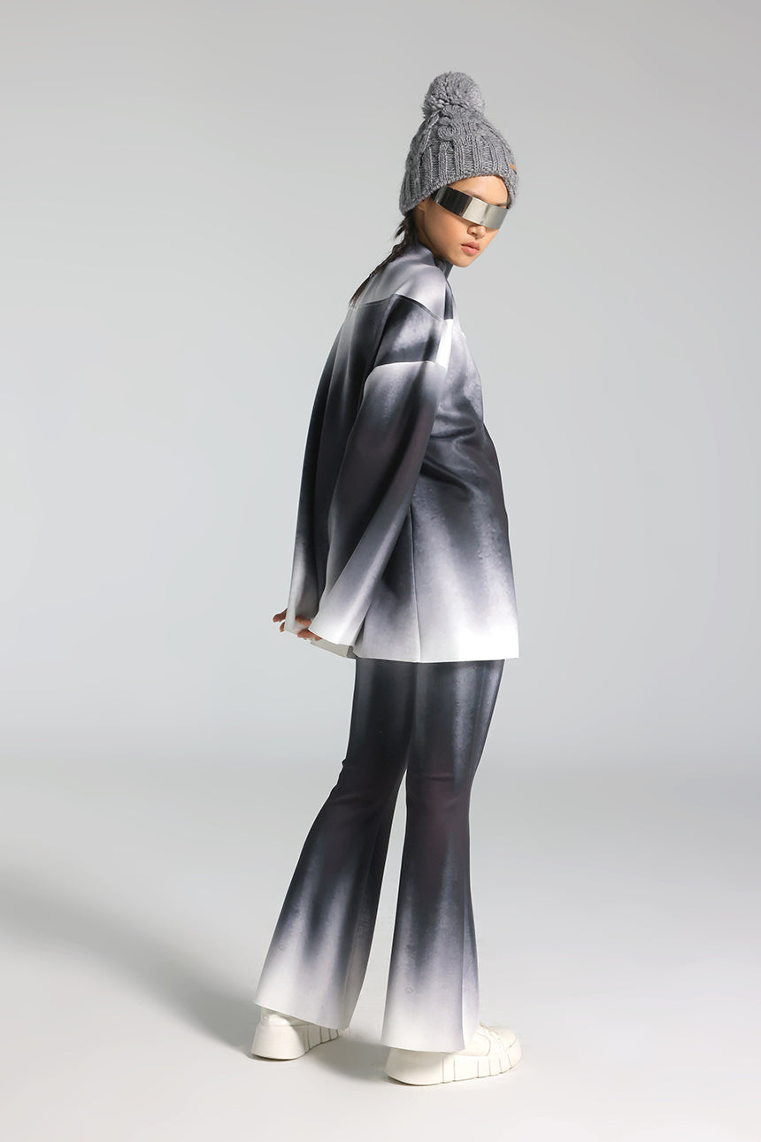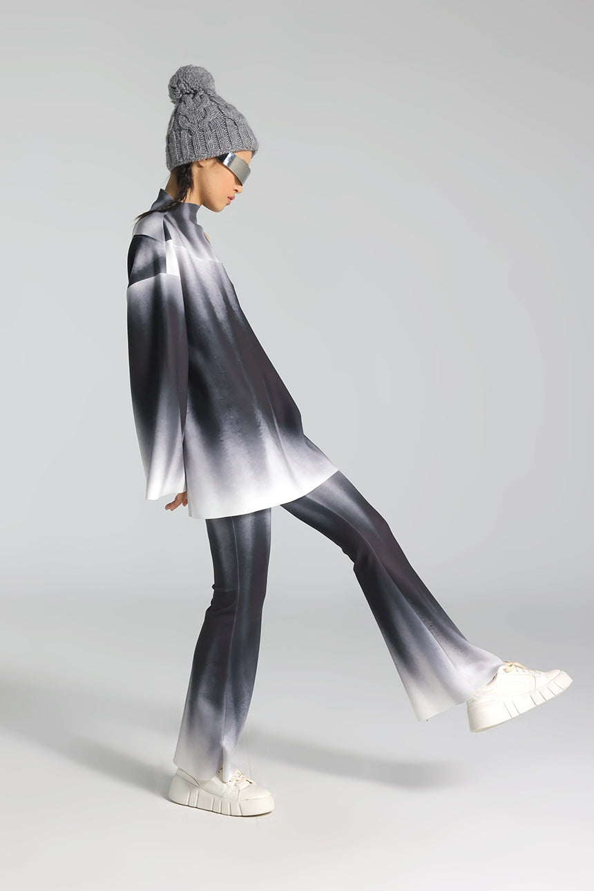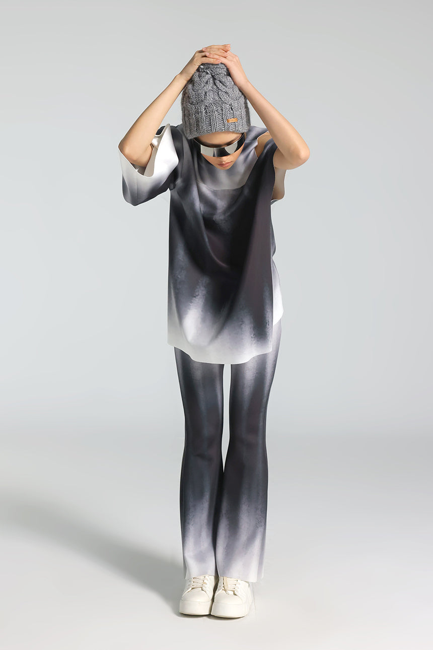 Elastik kemeri ve genişleyen paça yapısıyla konforlu bir form sunan bu pantolon, baskılı tasarımıyla modern ve enerjik bir görünüm yaratır.